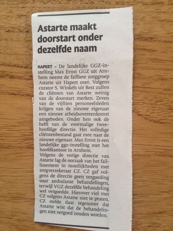 Hapert – De landelijkse GGZ-instelling Max Ernst GGZ uit Arnhem neemt de failliete zorggroep Astarte uit Hapert over. Volgens curator S. Winkels uit Best zullen de cliënten van Astarte weining van de doorstart merken. Zeven van de vijftien personeelsleden krijgen van de nieuwe eigenaar een arbeidsovereenkomst aangeboden. Onder hen ook de helft van de voormalige tweehoofdige directie. Het volledige cliëntenbestand gaat mee naar de nieuwe eigenaar. Max Ernst is een landelijke GGZ-instelling met het hoofdkantoor in Anhem.